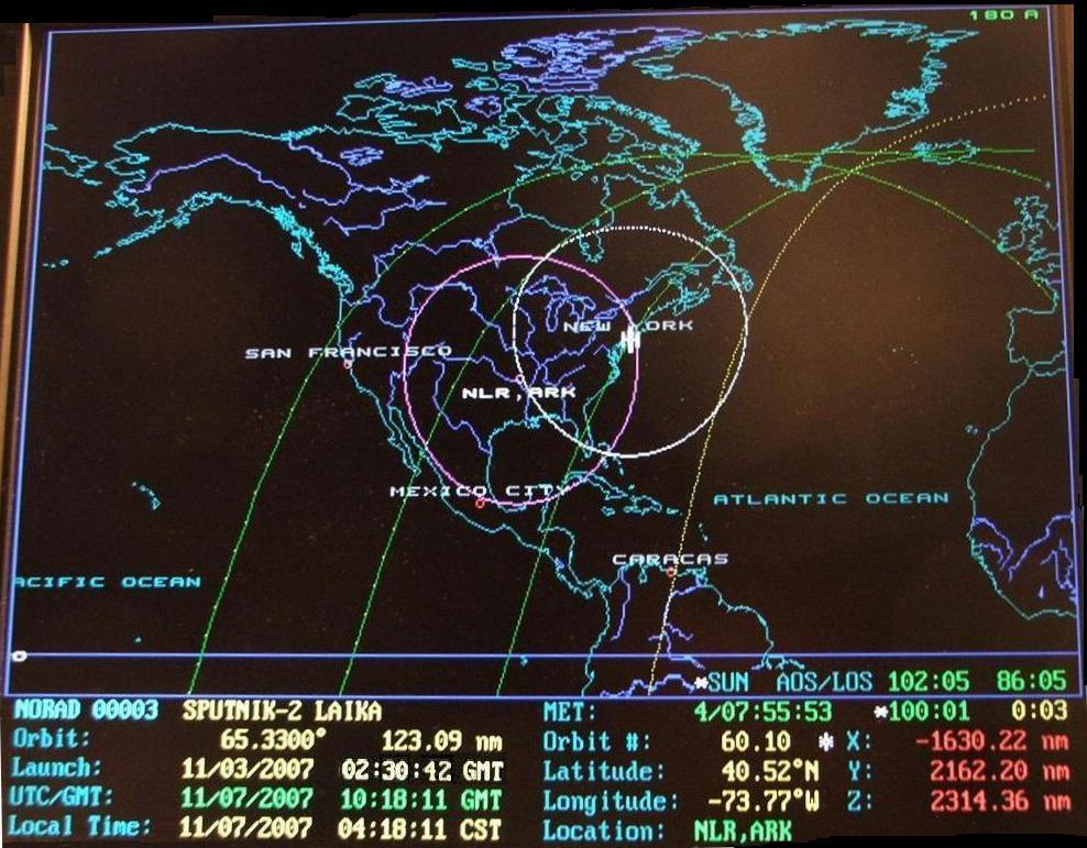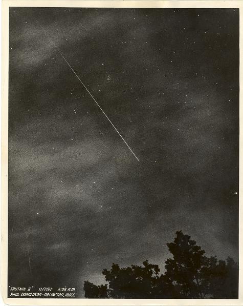 Above, the dog star that was Sputnik-2, is shown gliding across the ancient star field on the morning of November 7,1957. Sputnik 2 circled earth every 103.7 minutes. Its orbit was inclined 65.33 degrees from the equator making Sputnik 2 pass over most of the populated earth in a given twenty four hour period. Paul Donaldson captured this time lapse photo of Sputnik 2 as it was ascending SW to NE up the East Coast of the US. At this point Sputnik 2 was near the closest approach to earth (Perigee 212 kilometers / 131.73 miles) where it was most visible to the naked eye. On November 8th ground observers noted that Sputnik-2 was as bright as the Dog Star Sirius.(11) I bought this photo on ebay. The Seller said it came from an estate sale and it was found in a basement among a stack of other pictures. This historical photo is lucky to have survived the passage of time. To his credit, Mr Paul Donaldson noted the date and time (Nov. 7,1957 - 5:08AM) on his photograph which gives it special Historical significance. |