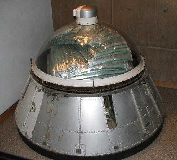 Above the Echo-2 backup, weighing 457 lbs, is shown folded down in a cannister and ready for launch. The real Echo-2 was launched from Vandenberg Air Force Base on January 25, 1964. After orbital insertion, it inflated into a huge reflective balloon at 135 feet in diameter. Over great distances, ground stations bounced radio signals to each other by using Echo-2 as a passive reflector. At the time, the largest object in surface area (not mass) ever placed in orbit, it was also used to conduct atmospheric drag and air density experiments. I made this photo at the New Mexico Museum of Space History in March 2006 when I traveled there to see the Pupniks Space Dog Exhibit. RETURN TO HOME PAGE AND INDEX |