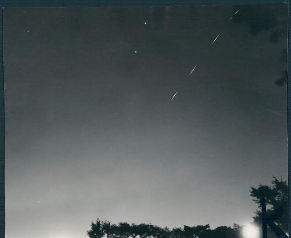 MID JULY 1958- COMING OUT OF THE SOUTHWEST SKY, THE SPUTNIK-3 ROCKET BODY IS SEEN AS IT ADVANCES TO THE NORTHEAST. THIS TIME LAPSE PHOTO WAS MADE FROM CHICAGO AND THE STREAKS OF LIGHT ON THE FILM SHOW HOW THE SPENT ROCKET STAGE WAS TUMBLING ALONG IN ORBIT. IN REAL-TIME, IT WAS VISIBLE AS A PULSATING POINT OF LIGHT TO EARTH BOUND OBSERVERS. CLICK ABOVE PHOTO TO SEE CREDITS AND ADDITIONAL INFO. NOTE- THESE OLD PRESS PHOTOS, ABOVE AND BELOW, WERE PURCHASED ON EBAY. |