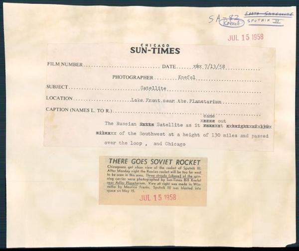 TUMBLING ALONG, THE SPUTNIK-3 ROCKET BODY APPEARS TO FLASH ON AND OFF TO GROUND OBSERVERS. THE LONG EXPOSURE OF THE CAMERA CAPTURES THE FLASHES AS STREAKS IN THE ABOVE PRESS PHOTO THAT WAS PURCHASED ON EBAY. NOTICE HOW THE STREAKS TAPER TO FINE POINTS REVEALING THE SLOW CHANGE OF BRIGHTNESS AS THE REFLECTED SUNLIGHT FROM THE SATELLITE CYCLES ON AND OFF. SEE PHOTO INFO AND CREDITS ABOVE |