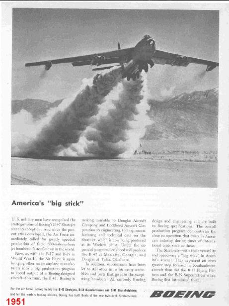 The above GIF movie is composed of six still images from a 1951 B-47 magazine Ad that I purchased on ebay. I digitally cut out each image and then plugged them into a GIF-Animator. The resulting movie is crude but it gives the viewer a feel for the rocket like JATO takeoff and the steep climb-out of the B-47. It must have been a wild ride for the crew. |