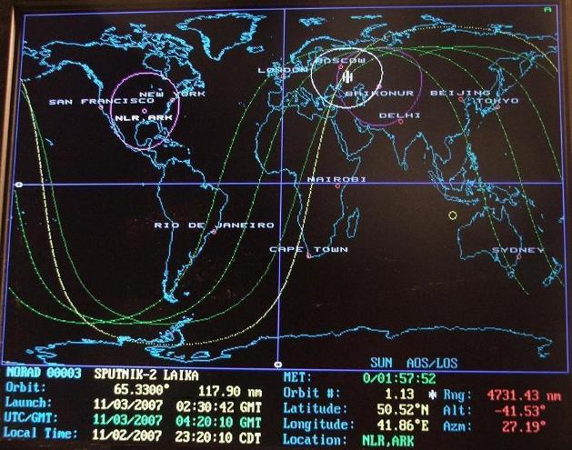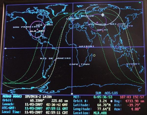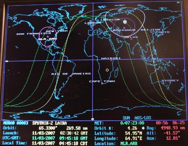 Starting on November 3rd, 2007, I ran the STSPLUS Satellite Tracking Program to simulate Sputnik-2s orbital position in real time in order to closely mimic the actual flight in 1957. Attached are screen photos showing Sputnik-2s location relative to key events. I used STSPLUS Tracking Software developed by the late David H. Ransom, Jr. from Pacific Palisades, California. Driving STSPLUS is TLE orbital information by Sven Grahn in Stockholm, Sweden. - see - Sven's Space Place + Tracking + Antique Element Sets |