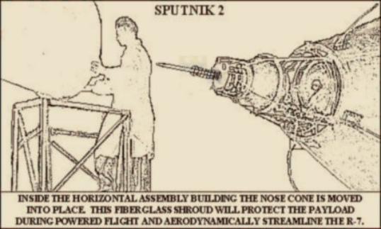 Inside the Assembly Hangar the nose cone is moved over the capsule with Laika.