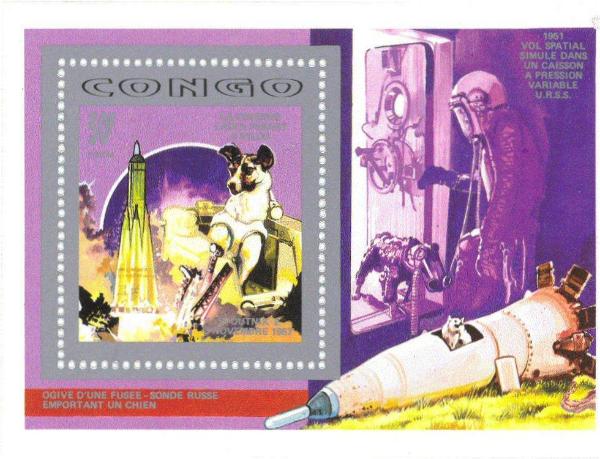 Soviet Union flight testing used animal test subjects, mainly dogs, sometimes rabbits, during the 1950s. The stamp above shows Laika posing inside her space box before her orbital mission on November 3, 1957 with the R-7 ICBM shown lifting off and configured for Sputnik-2. To the lower right we see a happy space dog peering out the hatch of a R-2A upper stage which has just made a parachute landing after a high altitude vertical flight. These up and down flights began in the early 1950s and lasted until the late 50s after Laika's orbital trip. The above souvenir sheet is from the Congo Republic. Also see the vertical flight stamp below, |
