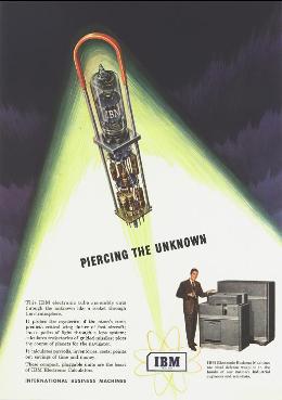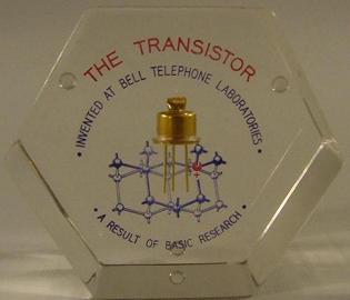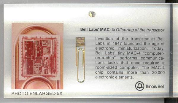 Above- Actual size of a plug-in vacuum tube switch and supporting components in a 1950s IBM computer. By comparison, see the paperweight below and the early computer chip which contains 30,000 components. |