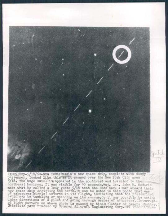 | May 18, 1960 - Reporting on a new Russian spaceship, Sputnik-4 passes over New York City with a dummy passenger, or,,, perhaps a human pilot in control ? Could it be, that an eager press and the speculation of Western experts, also helped to fuel the missing cosmonaut rumors ? -(above- press photo from ebay) |