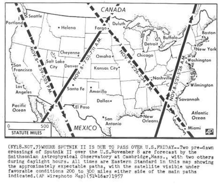 NEWSPAPERS ROUTINELY PRINTED MAPS THAT FORECAST WHEN AND WHERE THE SPUTNIKS WERE VISIBLE. THE ABOVE MAP PREDICTS DIFFERENT ORBITAL PASSES FOR SPUTNIK-2 ON NOVEMBER 8, 1957. |