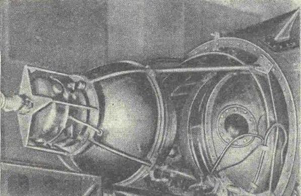 | At Baikonur Cosmodrome and within the huge Horizontal Assembly Hall, the Sputnik-2 payload is seen here attached to the nose of the R-7 rocket. The R-7 is resting on a special rail car and Laika is sealed inside her capsule at this point. Note the small window, her only source of light. During this phase of the preparations, Laika had to lay on her side until the rocket was rolled out to pad #1 and uprighted. The Sputnik-1 backup sphere, minus its 4 rod antennas, is seen to the left of Laika's capsule. It contained the 20.005Mhz and 40.002Mhz transmitters similar to the on-orbit Sputnik. The 4 antennas were relocated to the right of Laika's capsule and one can barely be seen in the upper right corner of the photo. The UV experiment package is seen to the left of the sphere. |